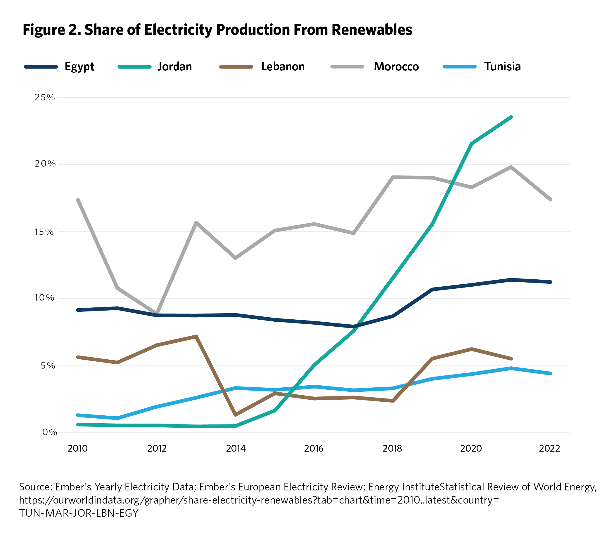 In contrast, Egypt, Tunisia, and Lebanon have lagged behind in transitioning to renewables. In the past decade, Egypt’s share of renewables in the electricity production increased from 9.36 percent in 2011 to only 12 percent in 2022.125 Tunisia is also facing significant challenges, with renewables representing a mere 4 percent of electricity production in 2021.126 Lebanon moved from 5 percent of its electricity coming from renewables in 2011 to 9.38 percent in 2021.127 This positive evolution was important as the country’s economic and financial crises forced many people to invest in solar power because of the prohibitive cost of fossil fuels. However, the shift to solar power has been largely haphazard, with limited supervision or regulation by state institutions, which is important to avoid future environmental problems.128 For Egypt, Tunisia, and Lebanon, closing the gap in renewables is crucial so that they can improve their energy security, reduce their dependency on fossil fuels, and mitigate the impact of energy price shocks.