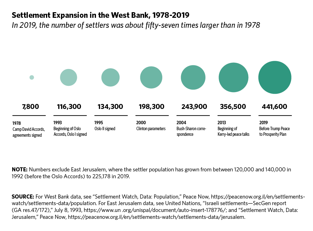 Israeli settlements have steadily expanded over the years. On the eve of the Oslo accords in 1993, the total numbers of settlers in the West Bank stood at 116,300.23 As of 2019, that number is estimated to be 441,600, along with an additional 225,178 settlers in East Jerusalem for a total population of 666,778.24 Israel evacuated 9,000 settlers from Gaza and a small northern West Bank enclave in 2005, while entrenching and expanding settlements elsewhere ever since.25 The settlements are a clear violation of international law and have been recognized as such in many UN Security Council (UNSC) resolutions, most recently in 2016 with Security Council Resolution 2334. They also correlate with the numerous displacements, land confiscations, and restrictions to movement and basic freedoms imposed on Palestinians by Israel.