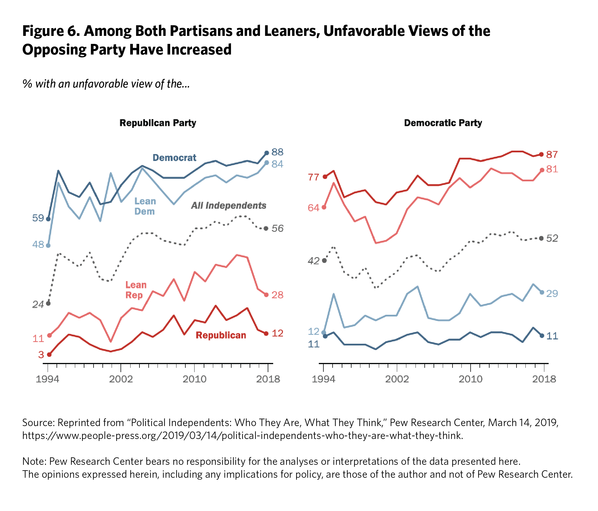 Scholars who looked at self-identification found that conservatives were more likely to identify as Republicans and liberals as Democrats, suggesting that the parties were sorting by ideology much more than in past decades. Self-reporting also showed that ideological moderates had declined, and the self-described distance between mainstream Democrats and Republicans (not their respective activist wings) had doubled between 1972 and 2004.60 In fact, voters seemed to have the opposite asymmetry to their representatives: the share of Democrats who claimed to be liberal doubled between 1994 and 2014, and those who were consistently liberal quadrupled. Republican voters did not experience as much movement to the right or consolidation. Pew Research Center speculated that Democratic voters might be consolidating in reaction to Republican members of Congress moving to the right in a highly public way, such as with the release of Gingrich’s Contract With America.61 Scholars also found that voters were more likely to change their positions to match their party affiliation, rather than switching parties to support candidates who supported their positions.62 These findings suggested that the public was also polarizing over policy.